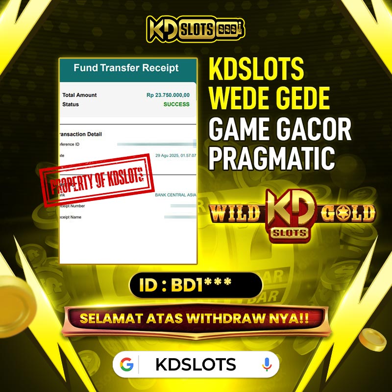 Selamat kepada member KDslots Game Wild KDSLOTS Gold (PP) id BD1***** Telah berhasil mendapatkan kemenangan sebesar Rp 23.750.000 Setelah mengisi formulir withdraw dengan kurang waktu hanya 3 – 5 menit pihak KDslots sudah melakukan transfer kepada pemilik User ID dan dana sudah dapat di cairkan oleh pemenang. Bukti pembayaran yang kami berikan merupakan bukti pembayaran yang SAH / VALID yang langsung di dapatkan melalui tanda transfer transaksi dari Bank yang dituju