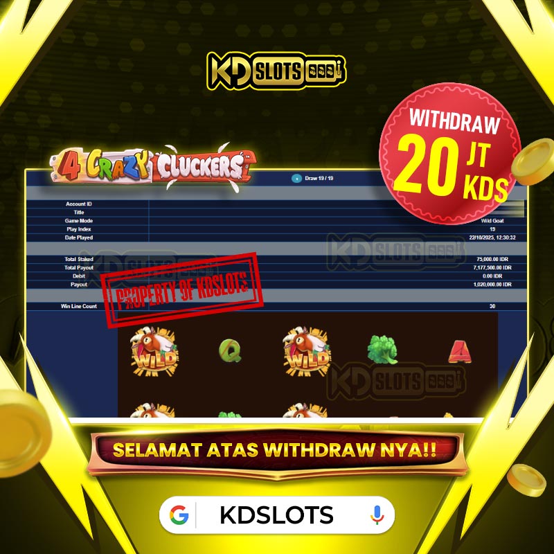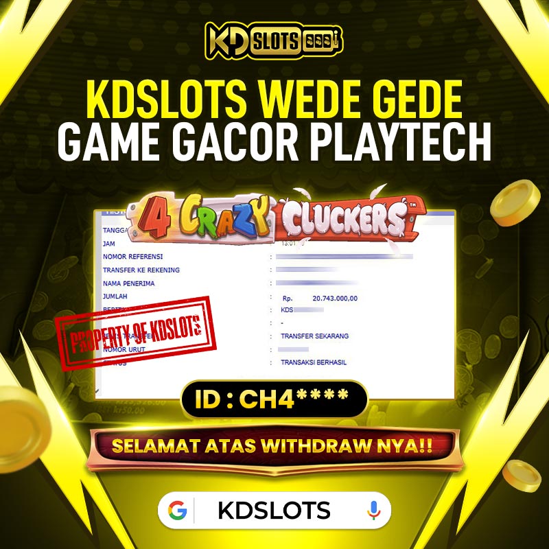 Selamat kepada member KDslots Game 4 Crazy Cluckers (playtech) id CH4***** Telah berhasil mendapatkan kemenangan sebesar Rp 20.743.000 Setelah mengisi formulir withdraw dengan kurang waktu hanya 3 – 5 menit pihak KDslots sudah melakukan transfer kepada pemilik User ID dan dana sudah dapat di cairkan oleh pemenang. Bukti pembayaran yang kami berikan merupakan bukti pembayaran yang SAH / VALID yang langsung di dapatkan melalui tanda transfer transaksi dari Bank yang dituju